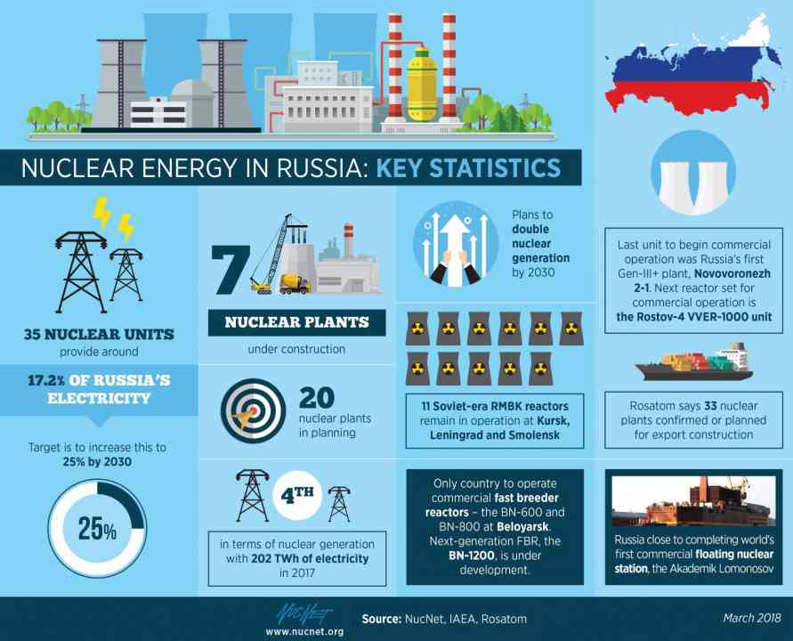 Rusko má ambiciózne plány na rozšírenie a rozvoj svojej jadrovej flotily so siedmimi jadrovými blokmi vo výstavbe a ďalšími dvadsiatmi v štádiu plánovania. 35 komerčných blokov dodáva približne 17% elektrickej energie, ale plánuje sa zvýšiť tento podiel na 25% do roku 2030. Začiatkom tohto roka Rusko uviedlo, že jadrová elektráreň (JE) Leningrad 2-1 generácie III+ typu VVER-1200/491 je pripravená na pripojenie do siete.