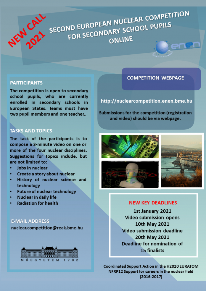 Úlohou tímu, zloženého z jedného učiteľa a študentov, je vytvoriť 3-minutové video s jadrovou tematikou. Vhodnou oblasťou by mohli byť napríklad zamestnanie v jadre, príbeh o jadre, história jadrového výskumu, budúcnosť jadra, jadrové a radiačné technológie v každodennom živote, zdravotníctve a pod. Prihlásiť hotové video bude možné v termíne od 10. do 20. mája 2021 cez stránku súťaže: http://nuclearcompetition.enen.bme.hu/.