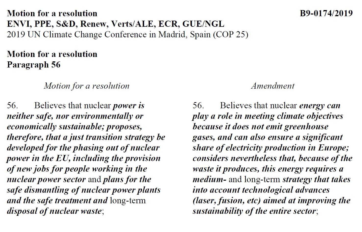 Európsky parlament tak kvôli konferencii OSN v Madride oficiálne uznal úlohu jadrovej energie pri plnení cieľov v oblasti klímy, pričom vo svojej rezolúcii uvádza: