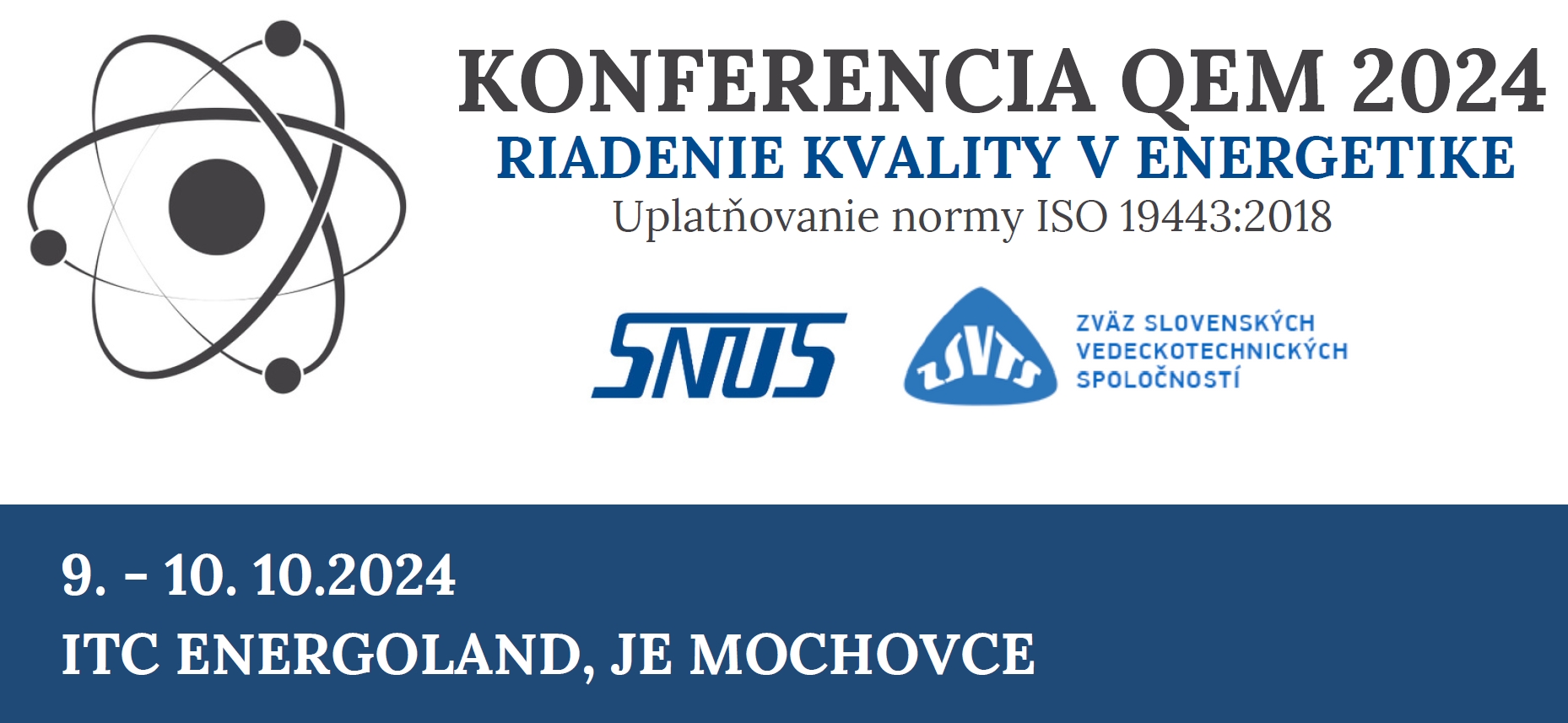 SNUS v spolupráci s partnermi si Vás dovoľujú pozvať na Konferenciu QEM 2024 – Riadenie kvality v energetike, s hlavným motívom „Uplatňovanie normy ISO 19443:2018“, ktorá sa uskutoční v dňoch 9. – 10.10.2024 v ITC Energoland v Mochovciach.