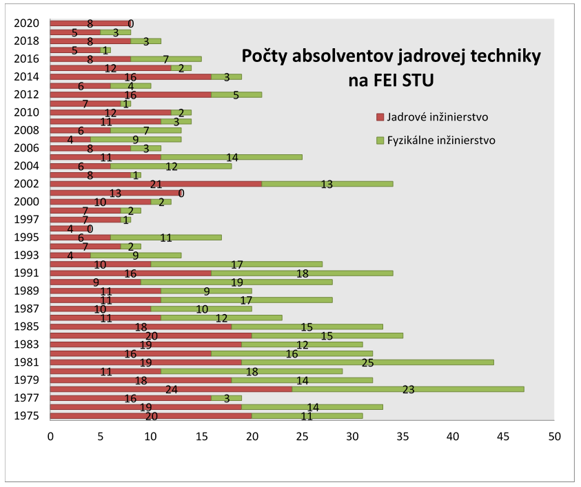 Ako súčasný garant študijného programu jadrové a fyzikálne inžinierstvo na Slovenskej technickej univerzite v Bratislave však musím priznať skutočnosť, ktorú dokumentuje priložený graf absolventov – zlyhávame. Uvedené počty nenaplníme, ani ak by sme medzi jadrových absolventov zaradili matfyzákov z Univerzity Komenského či kolegyne z prírodovedeckej fakulty, ktorých ročne býva tak do desať.