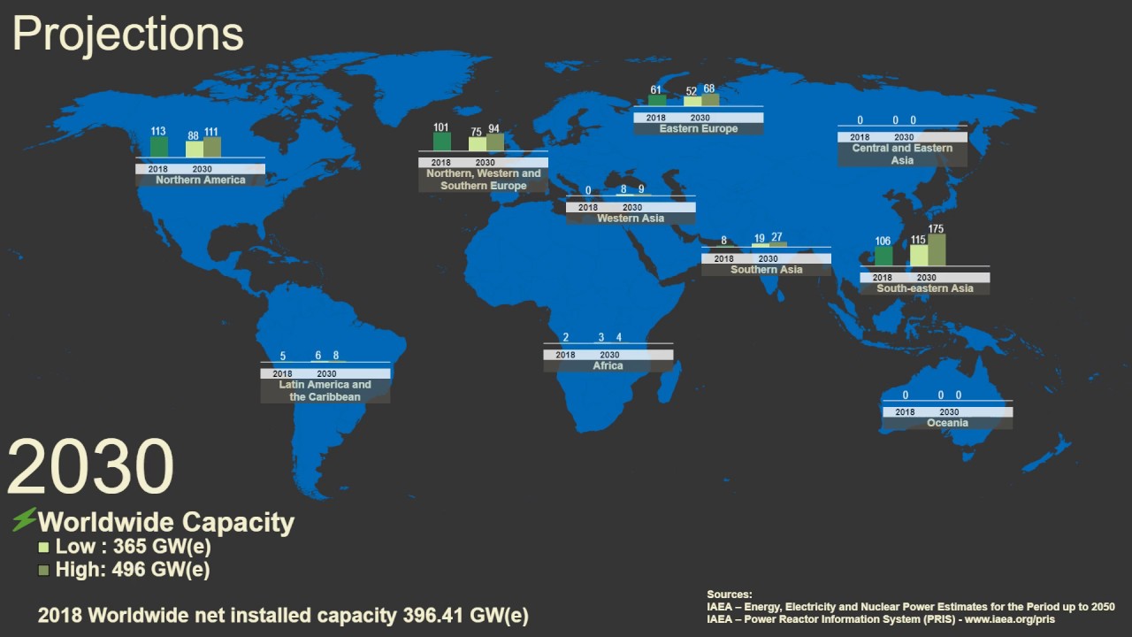 Prognózy Medzinárodnej agentúry pre atómovú energiu (MAAE) do roku 2030 naznačujú, že globálna kapacita výroby jadrovej energie by sa mohla znížiť približne o 8% alebo – v inom scenári – sa zvýšiť o 25%.