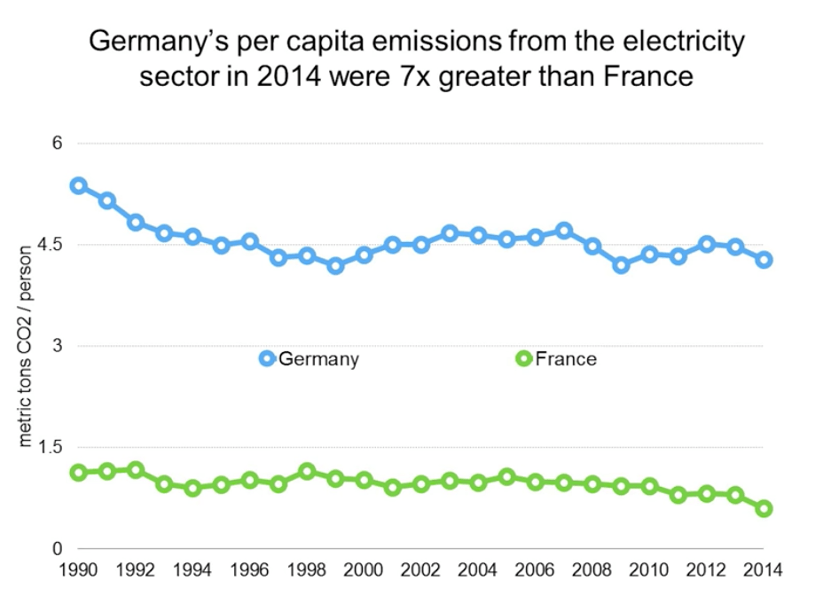 Podľa správy OECD Nemecko v rokoch 2006 až 2017 zvýšilo cenu elektriny pre domácnosti o 50 %. Vo Francúzsku tvoria náklady na elektrinu len 59 % nemeckých cien. V porovnaní s Nemeckom Francúzsko produkuje len jednu desatinu uhlíkového znečistenia z elektriny.