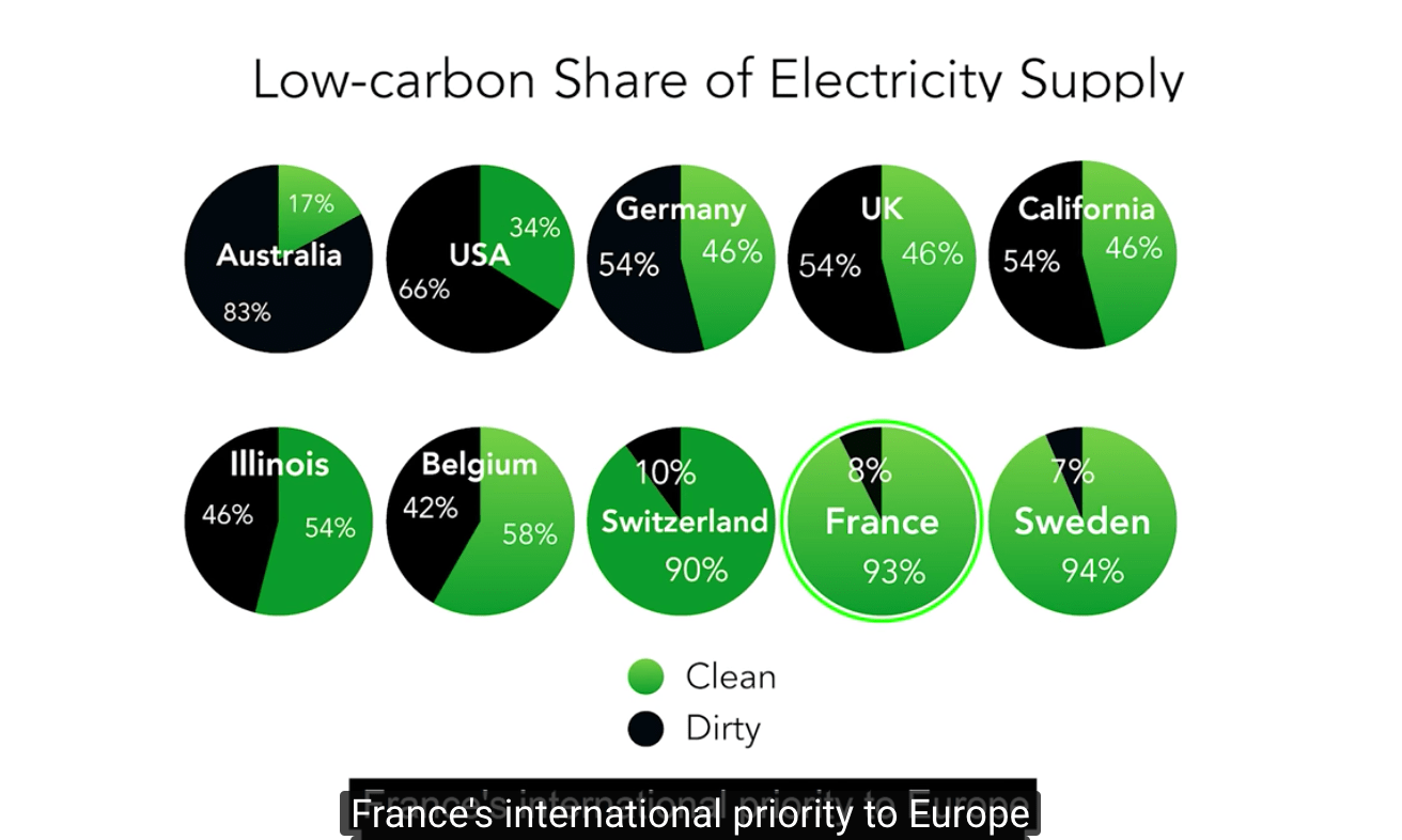 Francúzsko získava takmer dvojnásobok TWh z jadrovej energie v porovnaní s Nemeckom a jeho energiou z obnoviteľných zdrojov (solárnych, veterných, vodných a z biomasy). Ročne vyrobí približne 400 TWh z jadra, kým celkový výkon zo všetkých obnoviteľných zdrojov v Nemecku dosahuje spolu len približne 220 TWh.