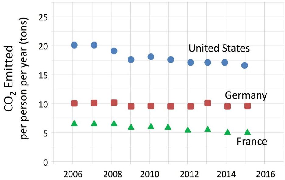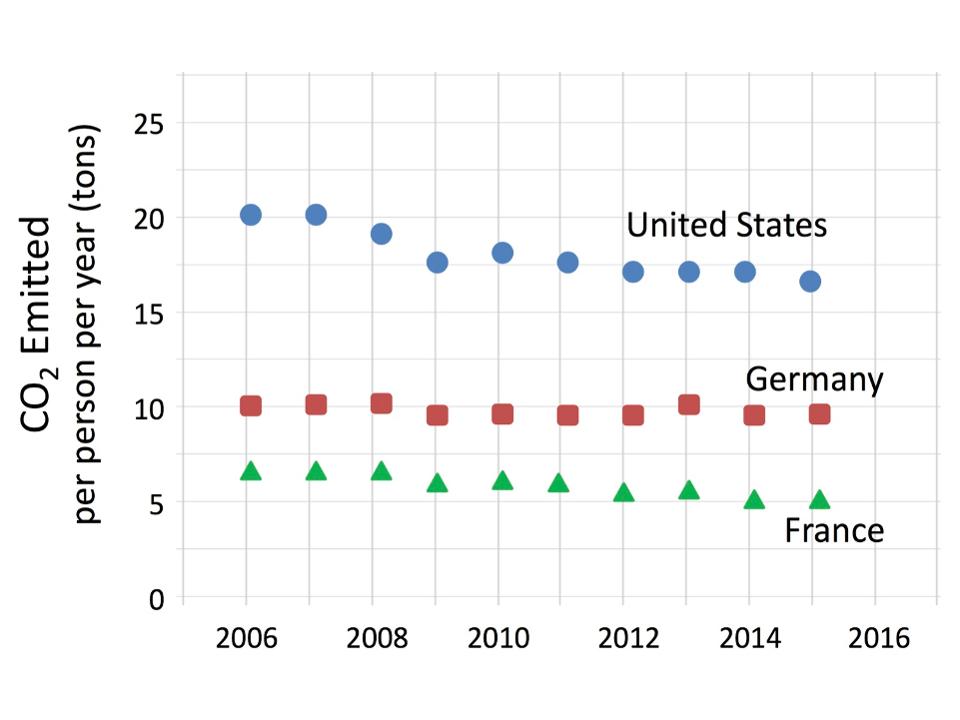 Porovnanie nemeckých emisií s USA či Francúzskom za posledných desať rokov len ilustruje tento efekt (pozri obrázok nižšie). Po prvé, Francúzsko má najnižšie uhlíkové emisie na obyvateľa, pretože elektrinu má väčšinou z jadra. USA majú najviac emisií per capita, pretože ešte stále vyrábame dve tretiny elektrickej energie z fosílnych palív. Nemecko je niekde medzi s 50 % podielom fosílnych palív.
