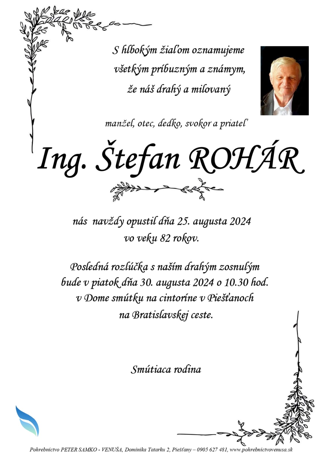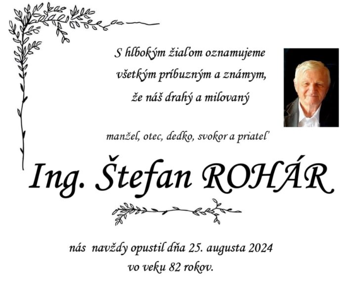 Oznamujeme všetkým členom a priateľom SNUS, že člen výboru Sekcie seniorov Ing. Štefan Rohár nás navždy opustil 25. augusta 2024 vo veku 82 rokov. Posledná rozlúčka bude v piatok dňa 30. augusta 2024 o 10.30 hod. na cintoríne na Bratislavskej ceste v Piešťanoch.