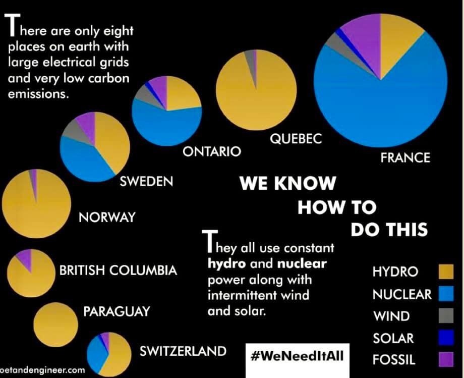 Samozrejme, bezuhlíková výroba nemusí byť len jadrová. Ďalšie kanadské mesto, tentoraz Quebec, dokázalo za rok 2016 vyprodukovať také isté množstvo elektriny ako celá Austrália a až v 95 % išlo o vodnú energiu. Takisto aj Švajčiarsko produkuje 60 % energie z vody a 33% z jadrových elektrární. Žiaľ, z vodnej energie môžu benefitovať len krajiny s hustou sieťou riek a dostatkom zrážok, napríklad Nórsko až 98 % elektriny vyrobí z vody.