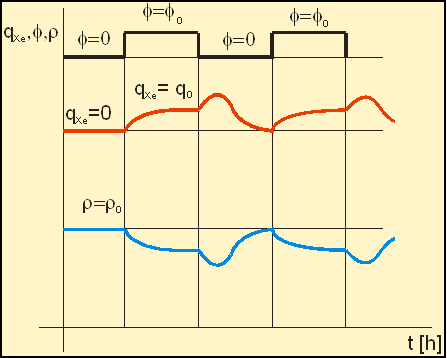Pri grafickom znázornení vidíme časový priebeh zmeny otravy reaktora červene, zmeny v reaktivite modro. Zmeny vo výkone sú reprezentované skokovými zmenami